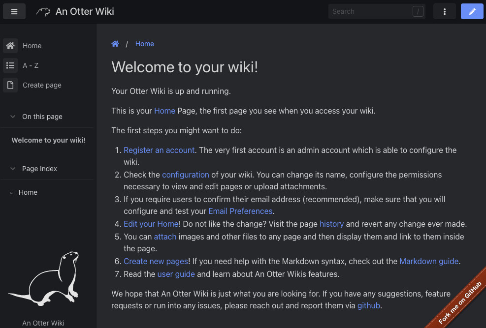 | 2023-11-18 14:40:43 34401d | Ralph Thesen | Configuration | Added documentation for configuring An Otter Wiki |