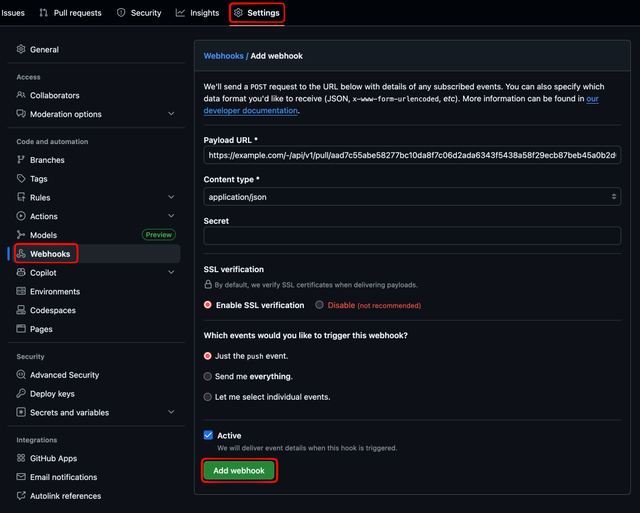 - Go to your GitHub repository > Settings > Webhooks > Add webhook